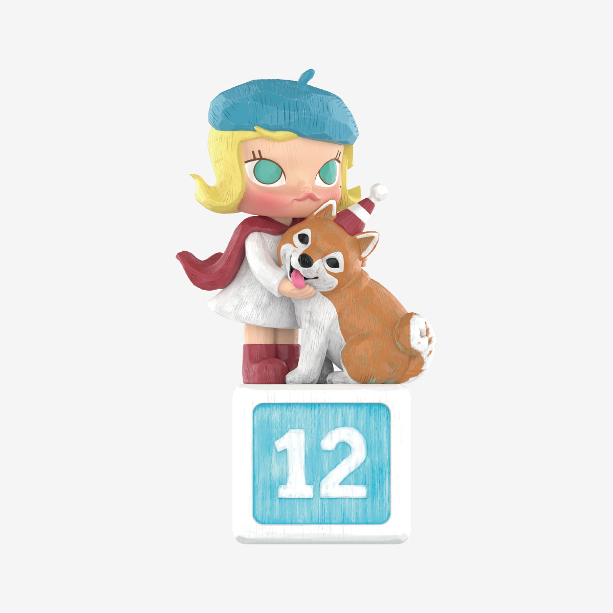 Standing at 4.5 inches tall, the figure is crafted from premium ABS and PVC materials, ensuring durability and detailed craftsmanship. Molly is depicted on a pastel blue block marked “12”, paired with her playful corgi companion, bringing warmth and loyalty to the design.